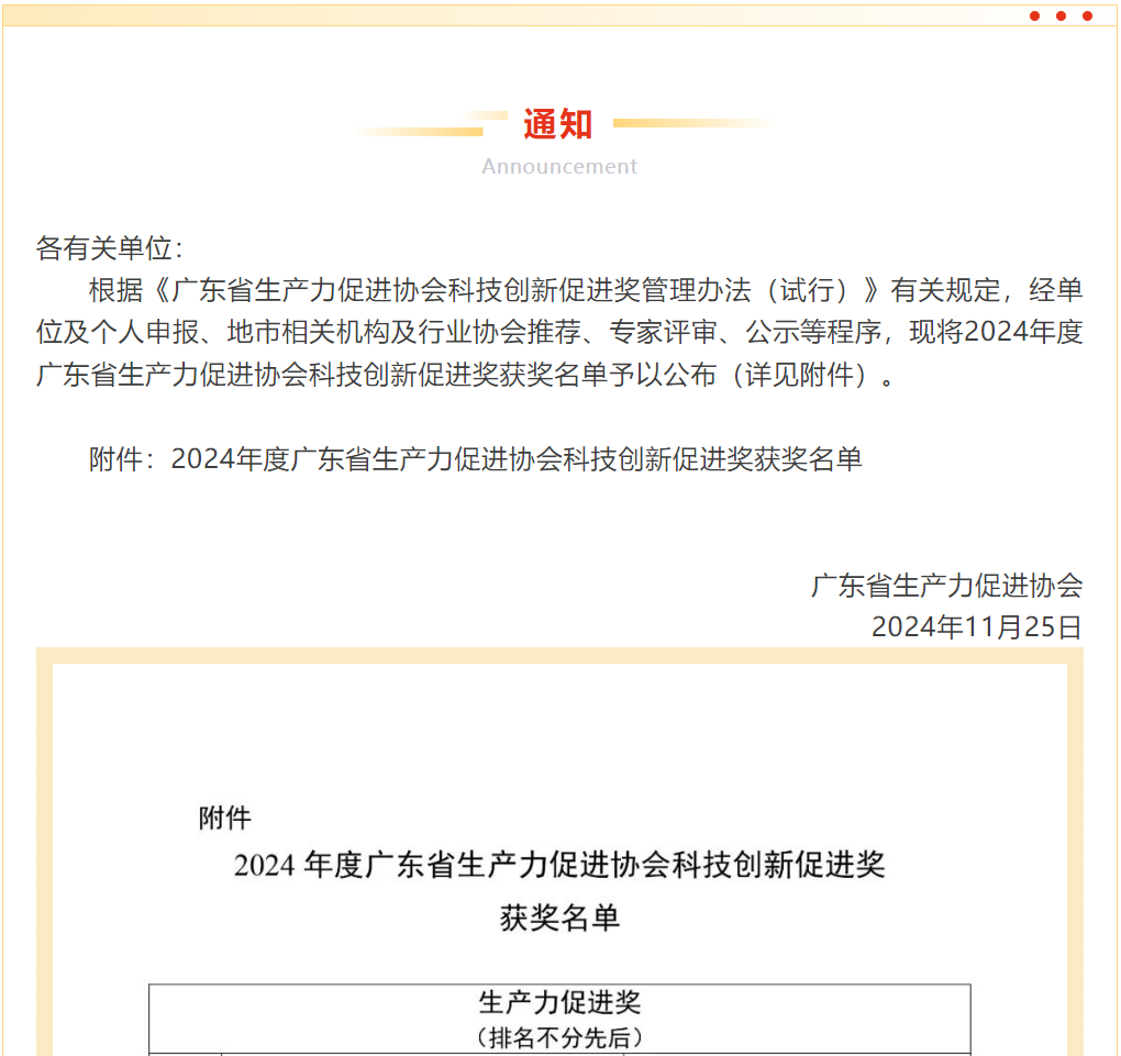 近日,广东省生产力促进协会公布《2024年度广东省生产力促进协会科技创新促进奖获奖名单》,惠州TCL环境科技有限公司(以下简称惠州环科)荣获“生产力促进奖二等奖”。